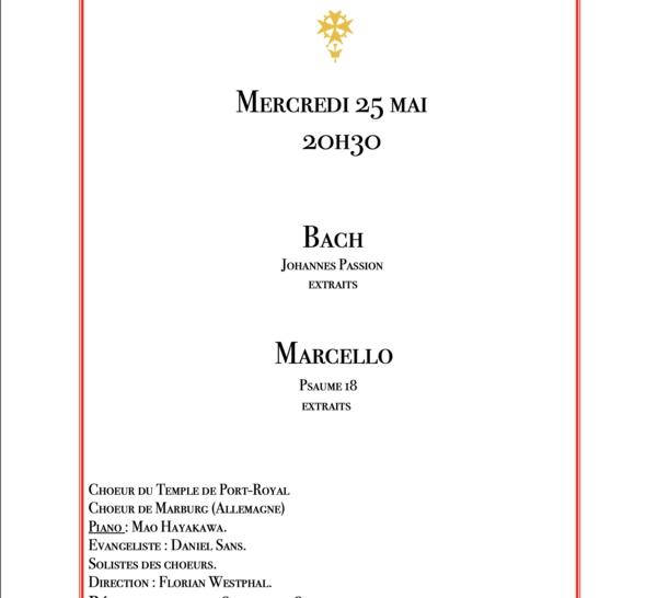 La chorale du Temple de Port-Royal et la chorale de Marbourg ont le plaisir de vous annoncer leur prochain concert. le mercredi 25 mai à 20h30 au Temple de Port-Royal - 18 bld Arago - Paris 13ème Au programme: BACH - Johannes Passion Extraits MARCELLO - psaume 18 Extraits Réservations : 06 95 44 59...