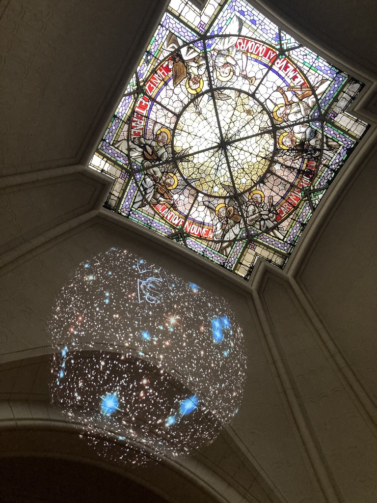 C’est alors que vos yeux se lèvent, et vous voici dans l’émerveillement. Vous contemplez une forme circulaire lumineuse étoilée bleue jouxtant la coupole où virevoltent depuis toujours des anges. Ce soir, dans le bleu, des humains escaladent les étoiles ! Vous partez dans l’infini et la béatitude.