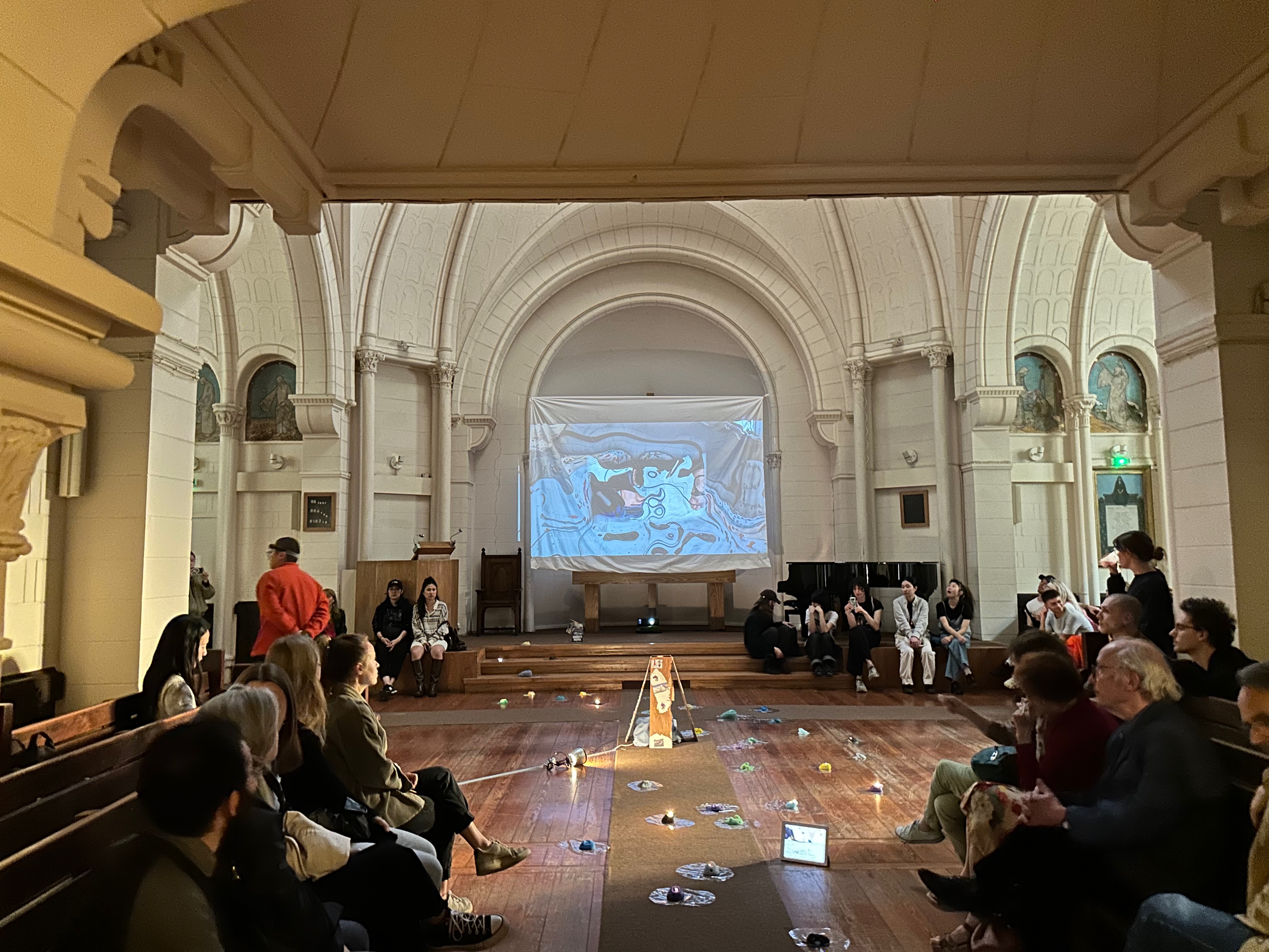 Dans une semi obscurité animée par un vent constant du côté des orgues, s’ouvre un chemin de lumière jusqu’à un écran devant la table. Là se meuvent des formes fluides et changeantes brunes, ponctuées de couleurs vives. Non, du temple, vous ne comprenez plus rien. Et encore moins avec une étrange structure à mi-chemin évocatrice des « pierres levées » de l’Antiquité.
