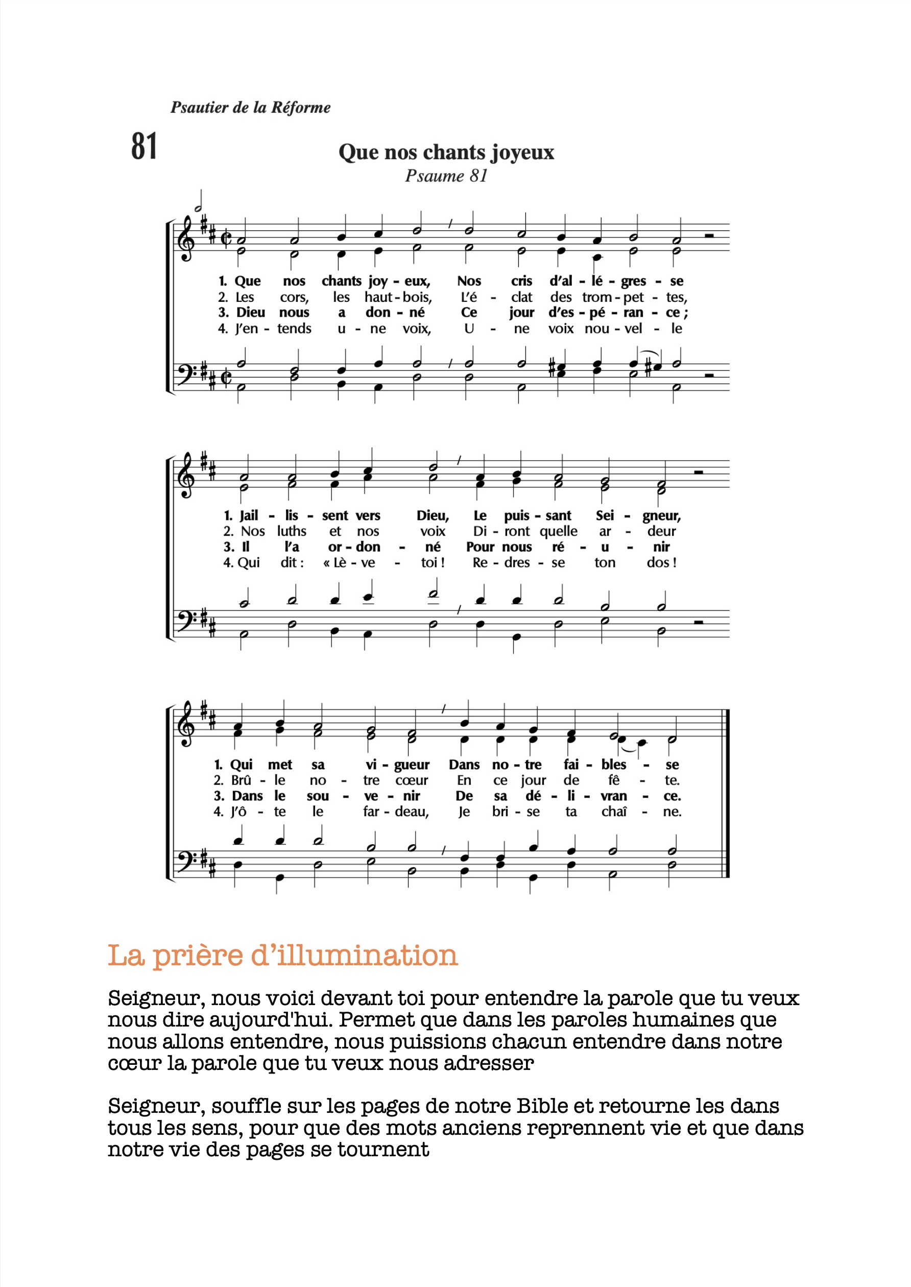 Nous nous levons pour continuer cette louange par le chant d'un autre Psaume, qui convoque aussi divers instruments, le 81 sur vos feuilles Je vous invite à vous relever.